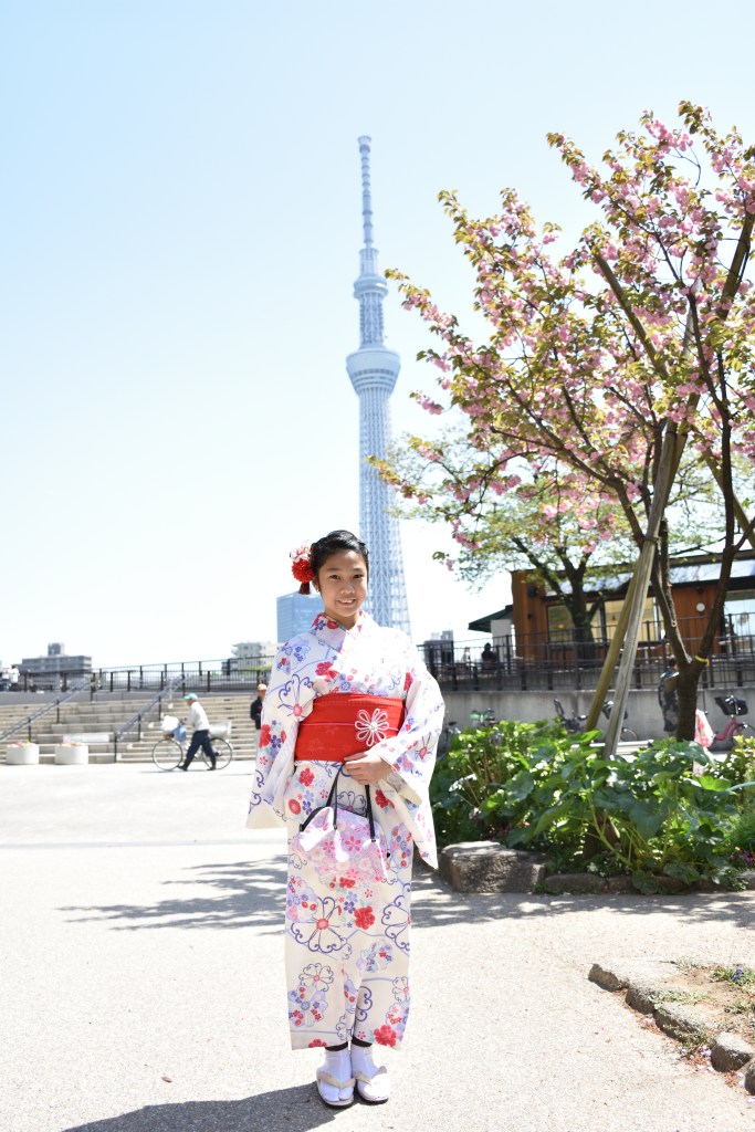 Leaving Sensoji Temple behind, we made our way to Sumida Park, situated along the serene Sumida River. The park is divided into two sections: the upstream section known as Sakura Terrace and the downstream section called Momijiyama (Maple Mountain). We only strolled along Sakura Terrace it has wide promenades, open spaces, and picturesque views of Tokyo Skytree, which stands nearby. The park’s natural beauty, adorned with cherry blossom trees, provided a tranquil setting for a leisurely stroll. As we wandered through the park, locals and tourists alike, mesmerized by our kimonos, couldn’t help but smile and greet us warmly.